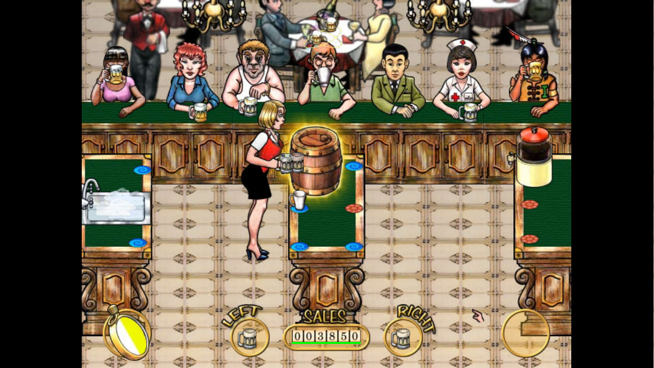 Jednak najpierw trzeba zapracować. Schemat jest prosty. W dwóch dłoniach możemy nieść dwa naczynia. Napełniamy je złotym płynem i serwujemy klientom. Aby zgarnąć ekstra gotówkę, myjemy szklanki i dostarczamy napitek jak najszybciej. Klienci, gdy skończą, zostawiają napiwki. Od czasu do czasu trafia się ktoś, kto przesadzi z procentami. Dajemy mu wtedy kawę, która stawia delikwenta na nogi. Przy okazji możemy złapać jakieś power up’y, które to pozwalają nam zarabiać większe pieniądze czy myć szklanki przez ich podnoszenie. Z każdym etapem cierpliwość klientów staje się mniejsza, a gra trudniejsza.
