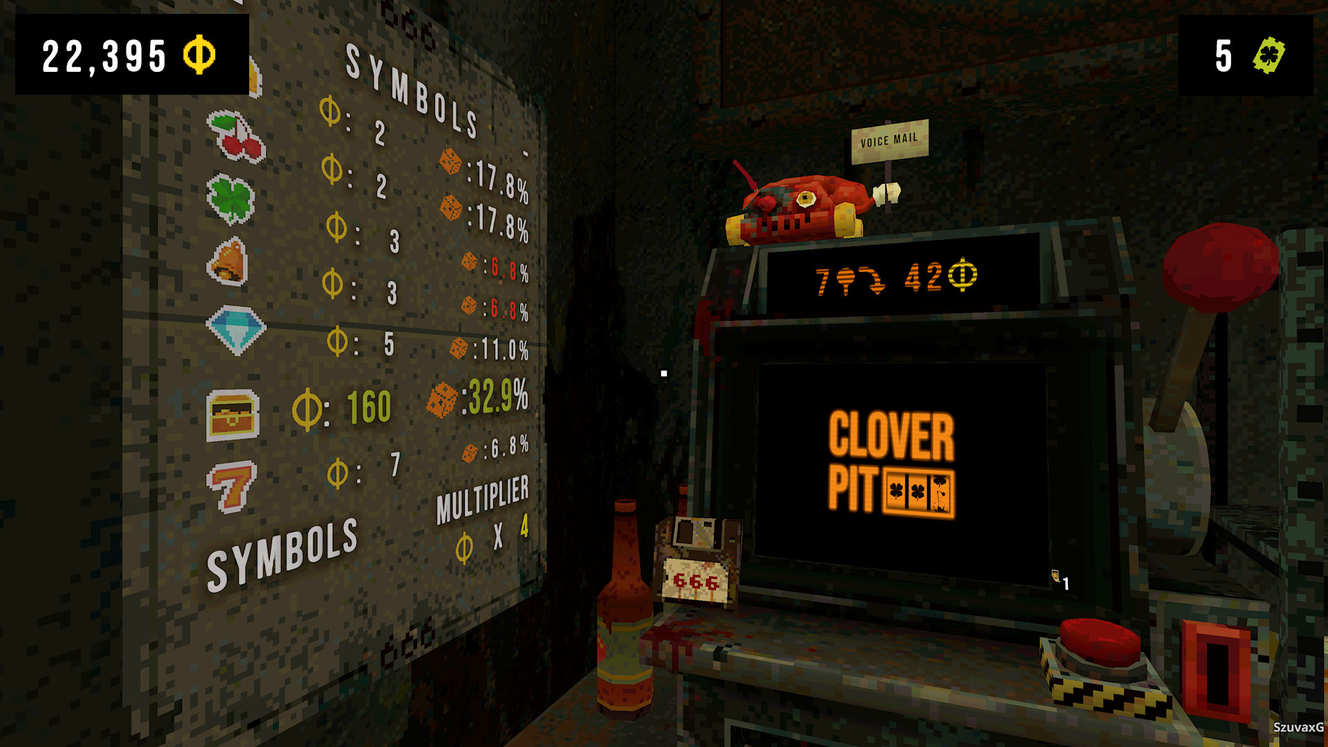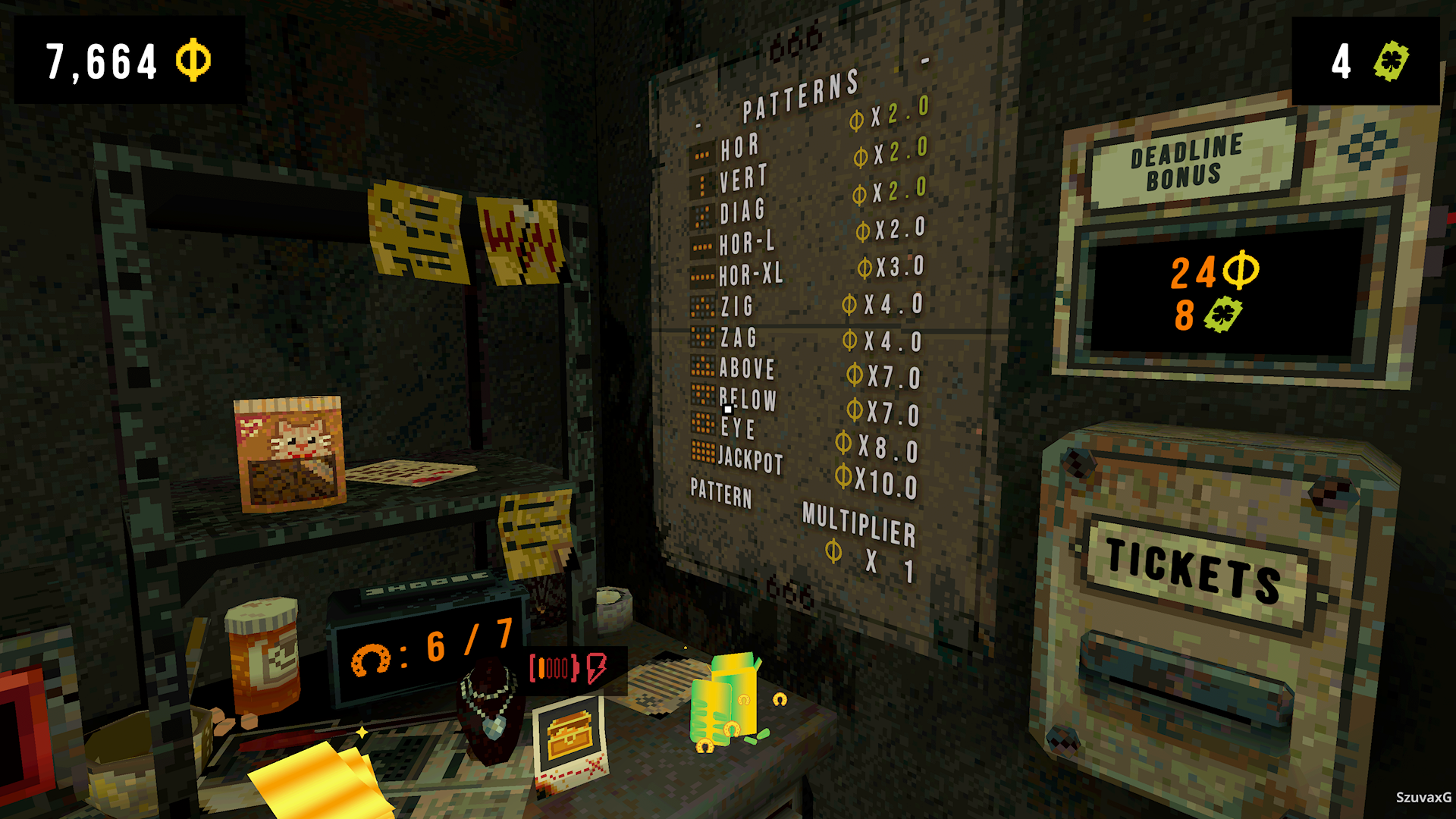 Tak więc pozostaje nam wejść do gry. Nie lubię hazardu i nigdy nie grałem na automatach. Gra jednak ma rozpisane figury i wzory, które muszą układać. W praktyce też wszystko toczy się samo. Ciągniemy za dźwignię i czekamy na rezultat. Po jakimś czasie zacząłem rozróżniać zależności i postanowiłem mieć większy wkład w swoje wyniki. Do manipulacji nimi służą nam specjalne przedmioty, które kupujemy za bilety z koniczynką. W trakcie gry odkrywamy kolejne z nich, gdy spełnimy określone warunki. Mają one swoje rzadkości i różne ceny. Pojawiają się jednak losowo i za każdym razem musimy dopracowywać naszą strategię na podstawie tego, co mamy.