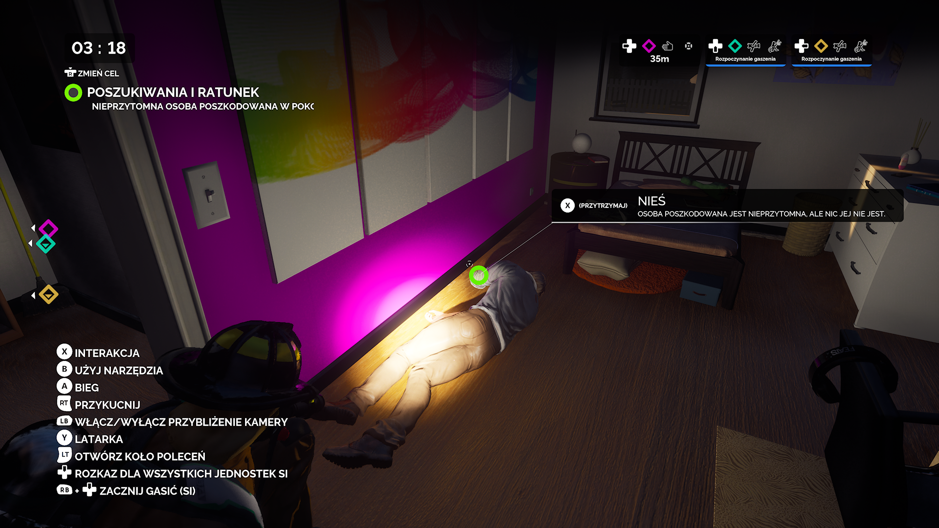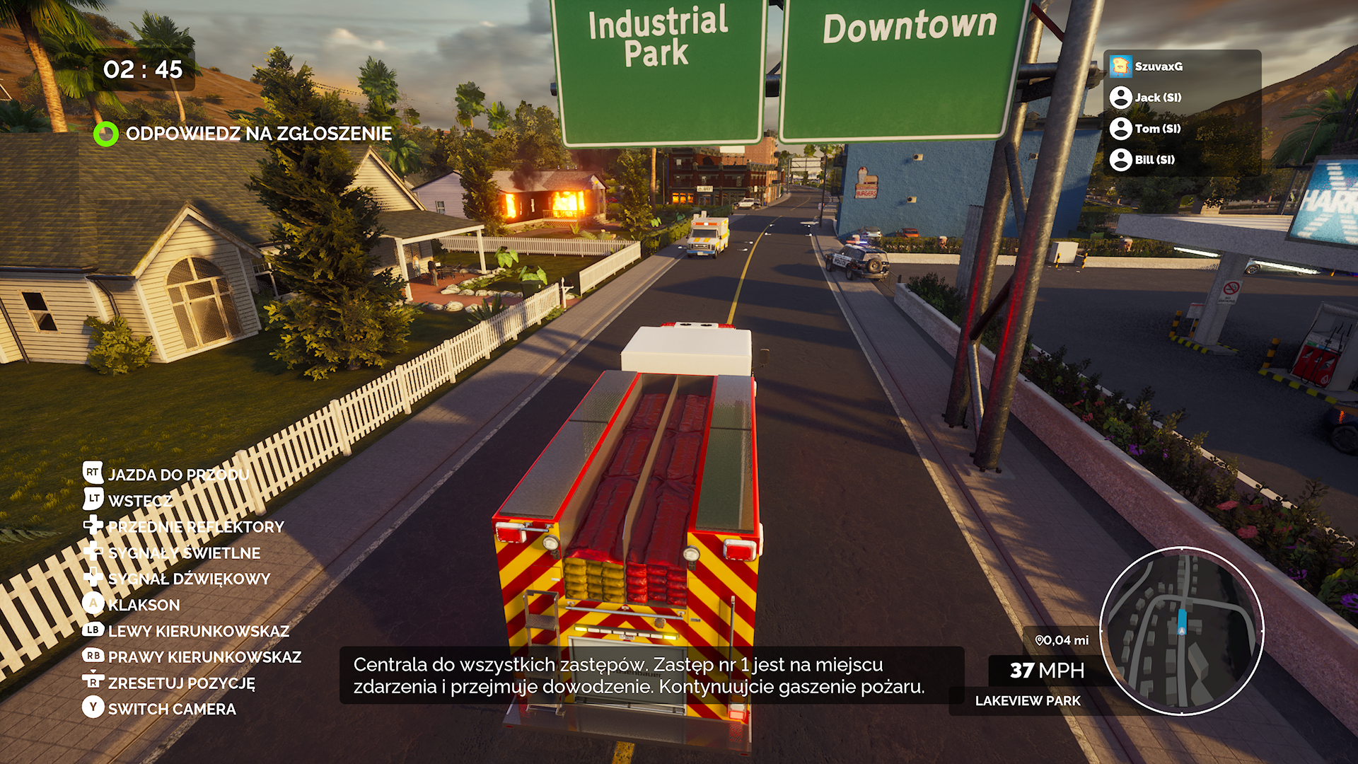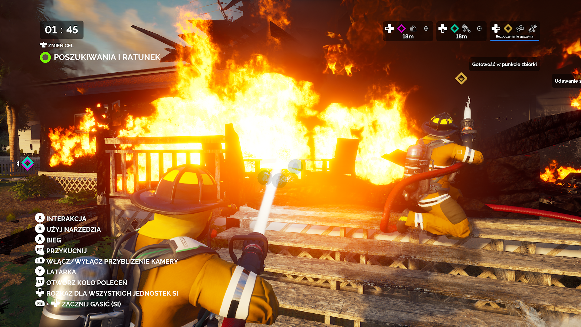 Tak mniej więcej wygląda cała rozgrywka. Powtarzalna mocno. Na misje możemy wybrać sobie wóz strażaki, ale nie widziałem zbytnio różnic w nich, oprócz drabin lub ich braku. Jedzie się długo, nudno. Na niektóre misje dojazd trwał tak długo, że znajomi szli sobie do kuchni coś zrobić do jedzenia. Jedzie tylko jedna osoba, a reszta śmieszkuje, że musisz robić coś tak nudnego. Graliśmy w trójkę, więc mieliśmy jednego bota w drużynie. To całkiem przydatne, bo sam podłączy waż na początku. Można też mu zlecić wyważenie jakichś drzwi, gdy nie chce się iść do wozu strażackiego po łom, albo zlecić mu wyniesienie ofiary. Trochę to odciąża od tych powtarzalnych rzeczy. Szkoda, że nie umie kierować.
