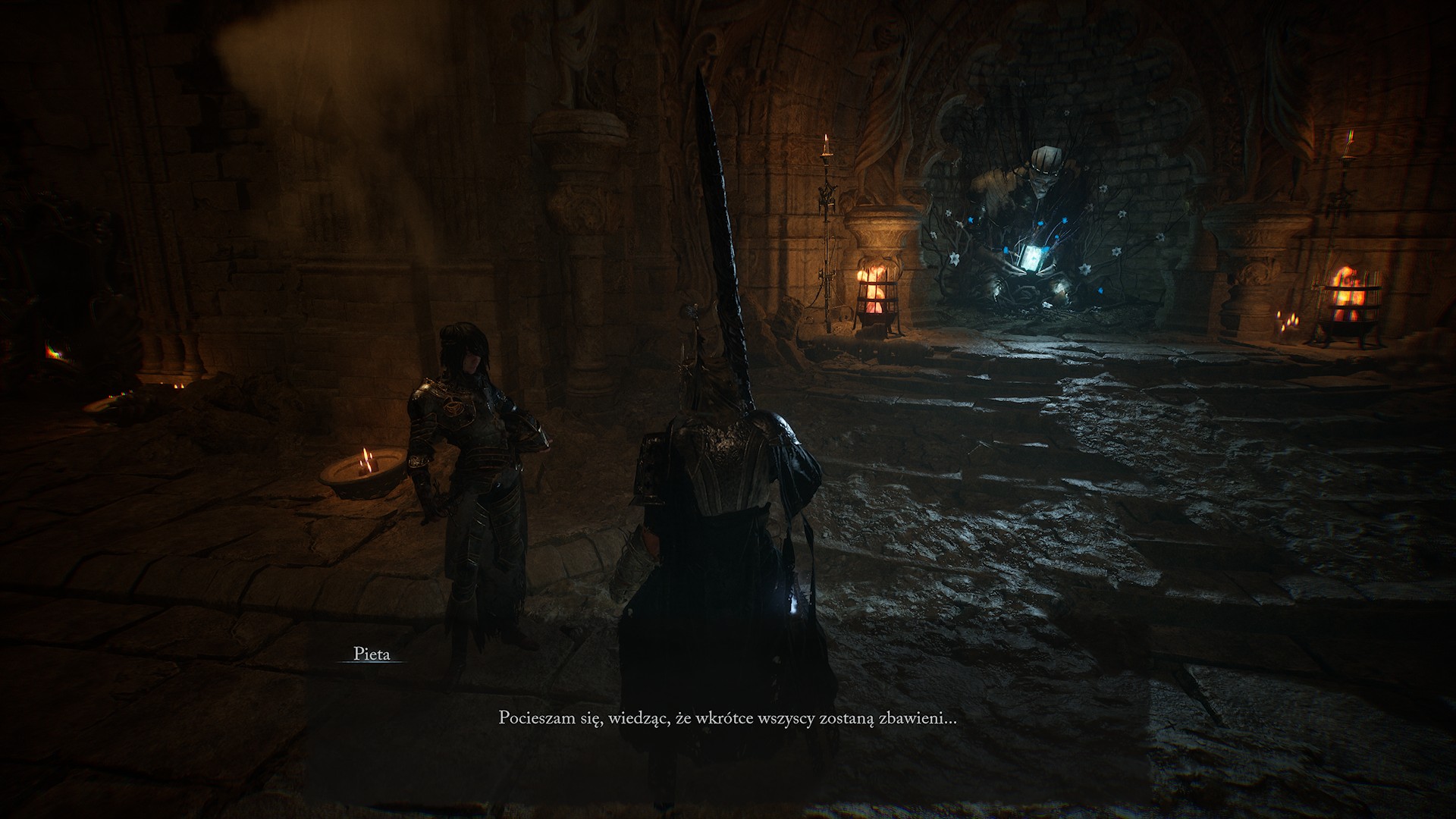 Bo klimat jest tu ciężki. Lokacje są często spowite w mroku co potęguję niepewność. Elementy otoczenia czasami są makabryczne i ociekające krwią. Jest to opowieść o krucjacie światła przeciwko piekłu, przy zastosowaniu nawet najbardziej brutalnych metod. W tle natomiast czai się pożerająca wszystko powoli pustka. Święci upadają, ludzkość ginie w ciemnościach i to naszym zadaniem jest określenie jaką ścieżką wszystko się potoczy. Wyborów nie ma tu aż tak wiele i nie są w żaden sposób sygnalizowane. To może być trochę problem, bo bardzo łatwo zepsuć sobie quest, gdy pójdziemy do złej lokacji w nieodpowiednim czasie. Warto zajrzeć do wiki. Szczególnie przy drugim podejściu. Oprócz tego, buildy czy inne elementy są na tyle proste do zrozumienia, że z czasem każdy powinien zrozumieć jak gra działa. Ale przede wszystkim trzeba oswoić się z walką i wybrać broń, która nam pasuje.