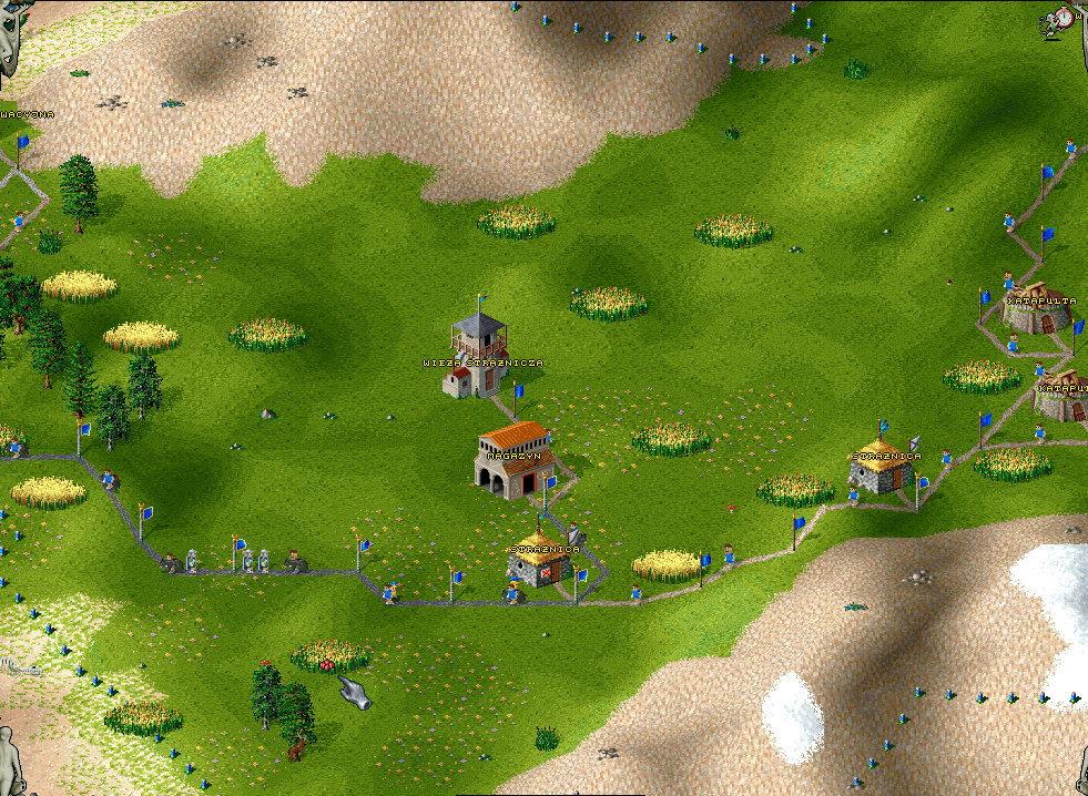 Na kampanie składa się 10 misji. W kolejnych odkrywamy nowe budynki i mechaniki, ale zasadniczo wszystko się powtarza. Tartak -> chatka drwala -> chatka drwala -> kamieniołom. A potem jedzenie, kopalnie, jakaś produkcja. No i koszary. Granice naszego terytorium poszerzamy przez stawianie budynków wojskowych. Pozwalają one też na awansowanie żołnierzy w nich stacjonujących. Ich doświadczenie zwiększa ich ilość życia, a także jeżeli się nie mylę szansę trafienia i uniku. Ale do walki wrócę jeszcze. Ekonomia skupia się na wydobywaniu surowców i poprzez wykorzystanie ich pozyskiwanie innych dóbr. Właściwie celem tego wszystkiego jest armia, więc przejdę jednak do tej walki.