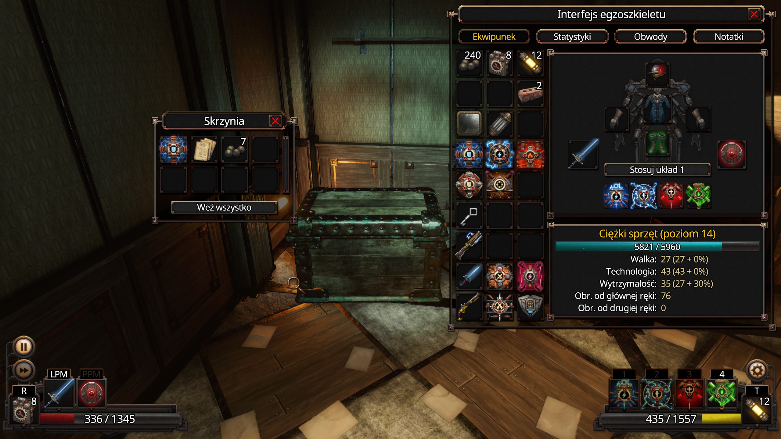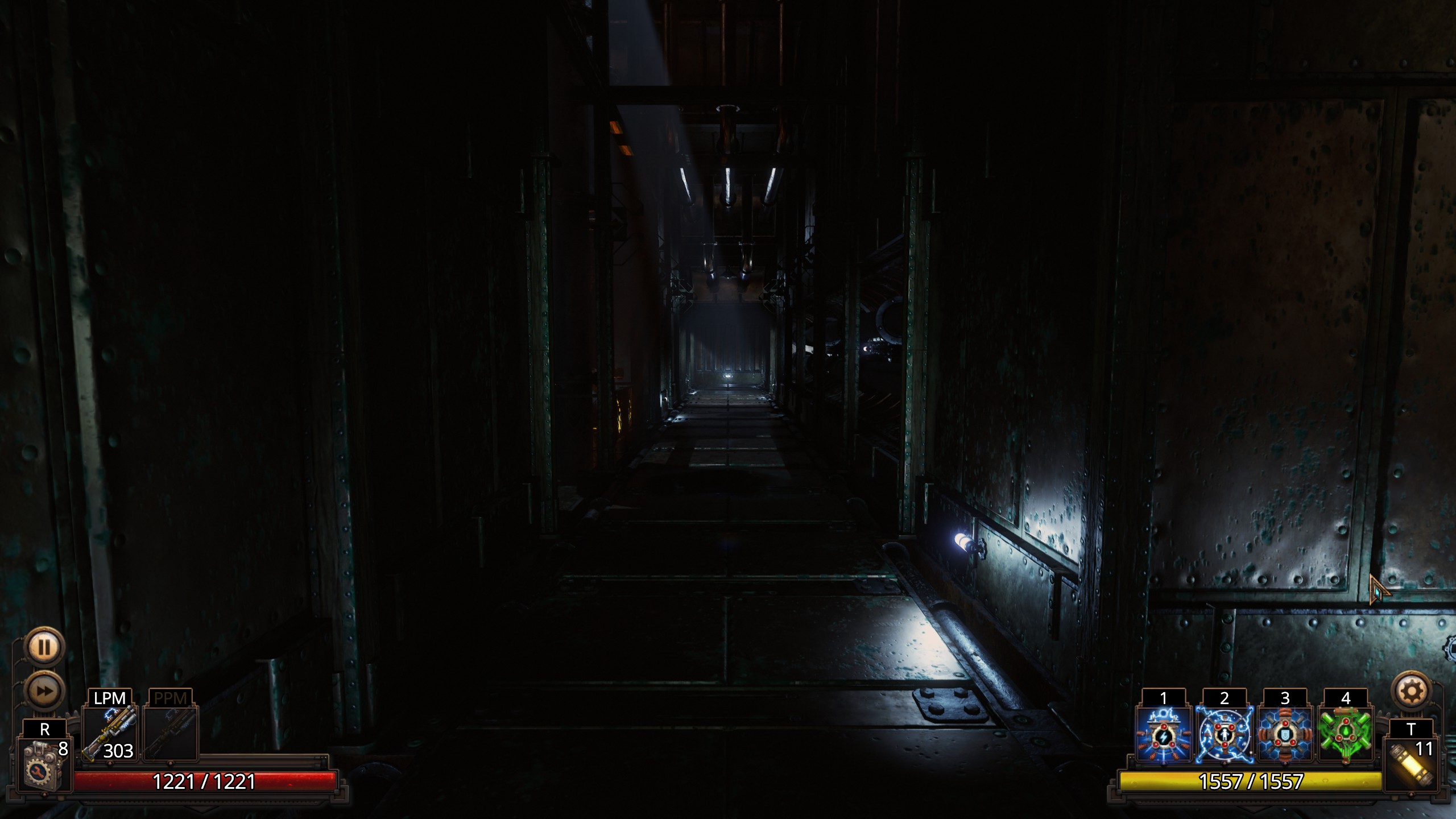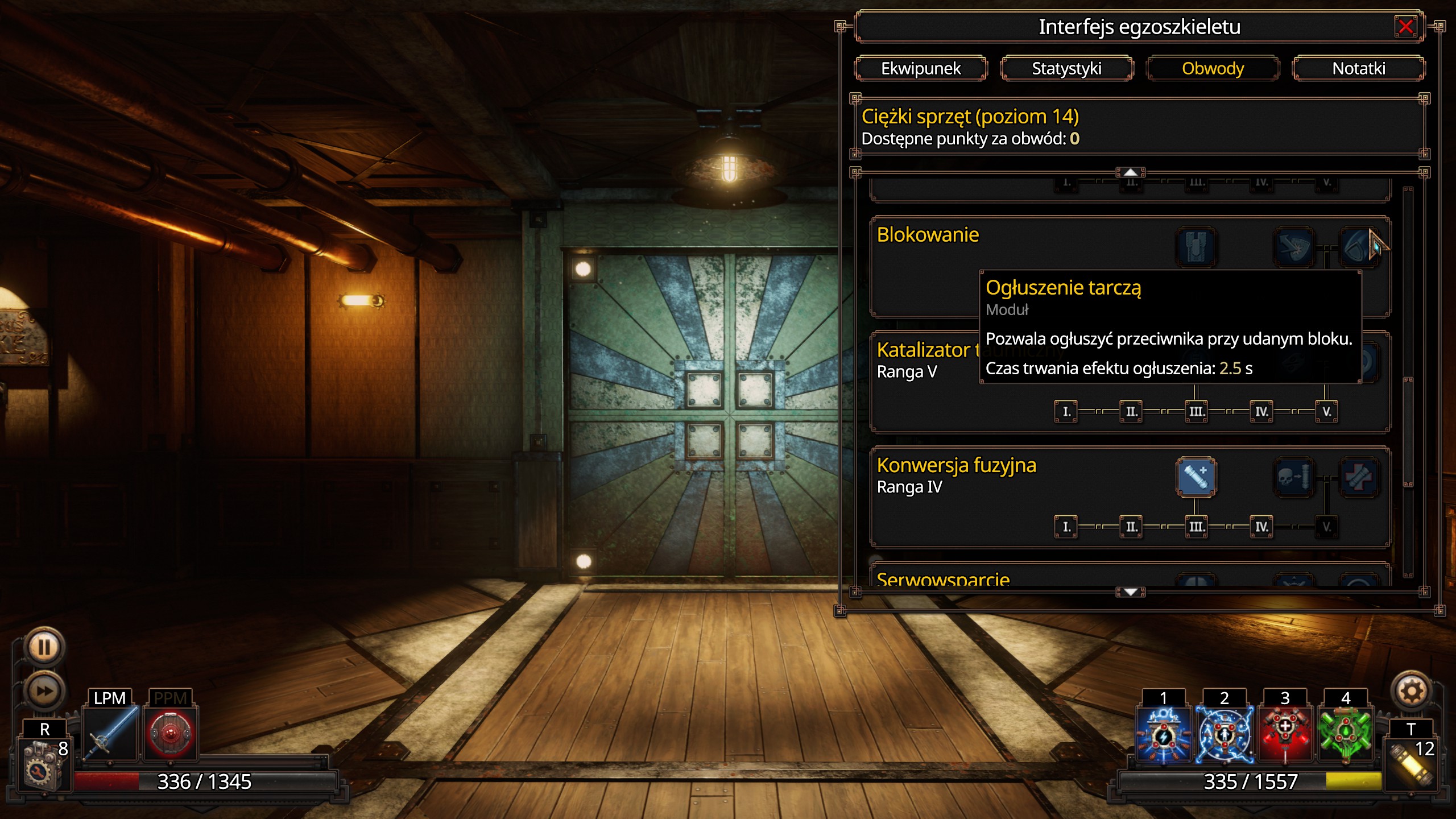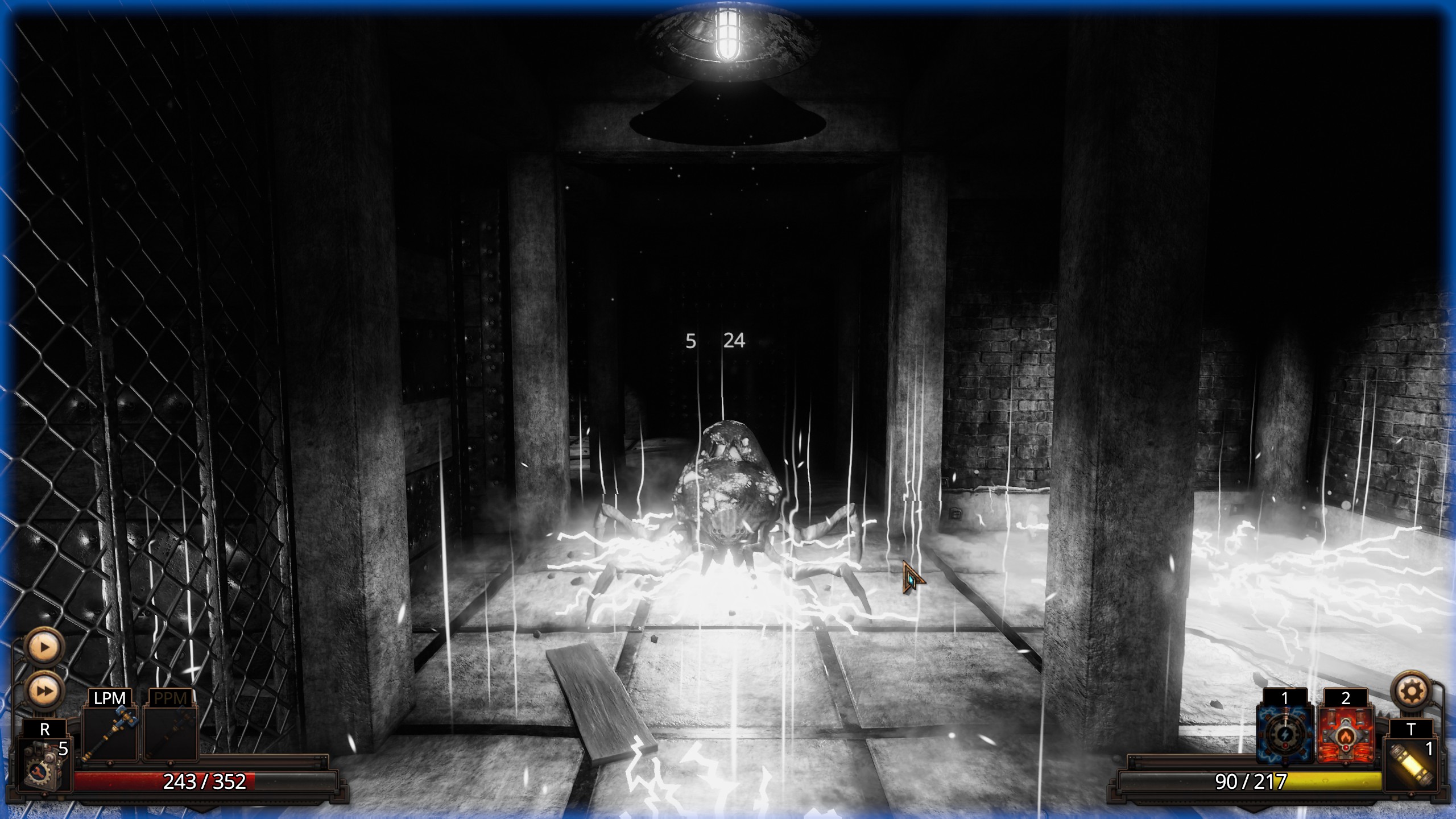 Do wyboru jest broń obuchowa i sieczna. Pierwsza skuteczna przeciwko dronom, druga dobra na organizmy żywe. Przy broniach jednoręcznych można dodać tarczę lub używać innej broni z karą za używanie dwóch broni jednocześnie. Pod lewym przyciskiem myszy jedna broń, pod drugim druga. Może to być na przykład pistolet jeżeli chcemy mieć opcję zasięgową. Broń palna to osobna kategoria, która zużywa amunicję. Nie jest to, aż taki problem jakby się mogło wydawać. Tej znajdujemy dosyć w podziemiach. Ostatnia forma walki to gadżety. Dosyć osobliwy rodzaj technologi bardziej pasujący do określenia „magia”. Zużywa energię naszego egzoszkieletu, dając różne efekty. Możliwe jest wzmocnienie swoich ataków, obrony, albo po prostu walnięcie aoe piorunami. W późniejszych etapach znajdujemy trochę ciekawszych gadżetów, na przykład jeden pozwalający na zamianę miejscem z przeciwnikiem. Walka solo to główna różnica w porównaniu z Legend of Grimrock, ale co najbardziej odróżnia te gry to system spowolnienia czasu. Działa to ciekawie, bardzo podobnie do tego co znajdziemy w grze Superhot. Gdy wykonujemy jakąś akcję, gra toczy się normalnie. Pomiędzy akcjami wszystko się zatrzymuje i mamy czas na przemyślenie kolejnego ruchu lub wymiany ekwipunku. Stąd uważam, że gra jest lepsza na początek niż Grimrock. Łatwiej level’ować jedną postać, sterować nią i jeszcze system spowolnienia czasu daję więcej czasu na nauke.